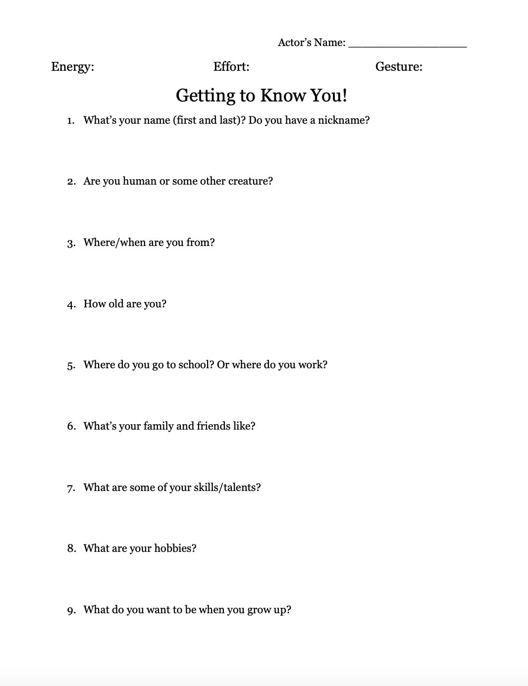 ● Students will be able to embody a unique character by utilizing the three elements of movement—physicality, energy, and gesture—to create a character and performing a “job interview” as their character.